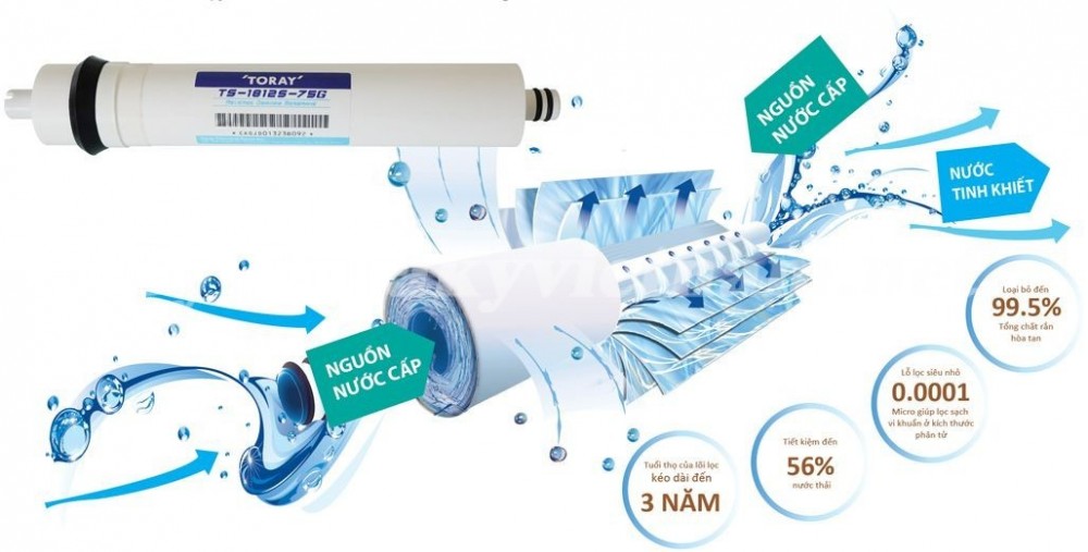 – Màng lọc RO Toray Nhật Bản có khả năng lọc sạch, loại bỏ hoàn toàn các tạp chất gây hại có trong nước như Các nấm có hại, độc tố, Chì, Asen, Mangan,…