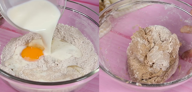 Sau đó, cho thêm 1 quả trứng gà, 130ml sữa tươi rồi tiếp tục dùng phới trộn đến khi nguyên liệu hòa quyện, tạo thành khối bột.